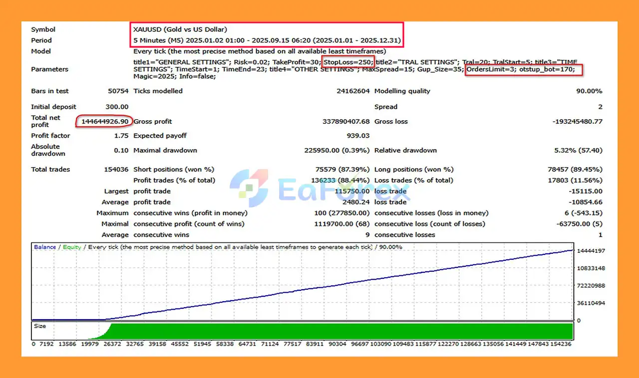 • Stable Performance and Low Drawdown: With a carefully calibrated algorithm, the EA demonstrates steady equity growth and low-risk exposure even during unpredictable market periods.