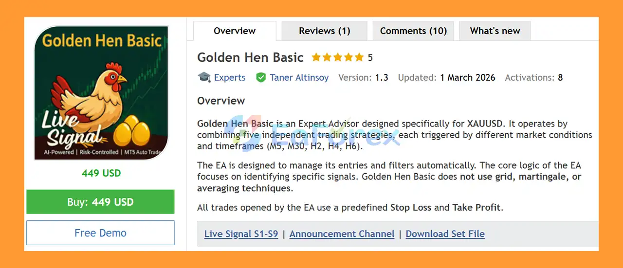 Golden Hen Basic MT5 is a fully automated trading robot designed for the MetaTrader 5 platform. It is optimized specifically for XAUUSD (Gold) trading and combines five independent trading strategies that analyze multiple timeframes to identify high-probability market opportunities.