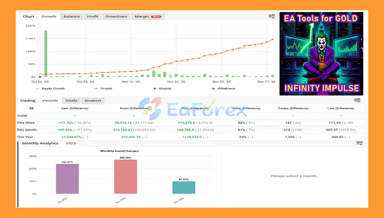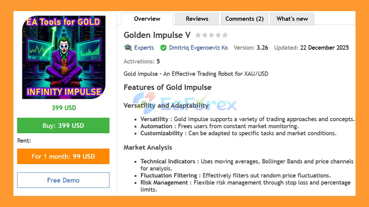 In summary, Golden Impulse V EA MT5 is a powerful automated trading system built specifically for Gold (XAUUSD) on the M5 timeframe. By combining impulse-based price analysis, technical indicator filtering, and flexible risk-management tools, it targets short-term trading opportunities while reducing noise and avoiding random entries. With customizable parameters, VPS-ready operation, and full auto-trading capability, Golden Impulse V EA MT5 is designed for traders seeking fast execution, adaptability across market conditions, and disciplined gold trading without constant chart monitoring.