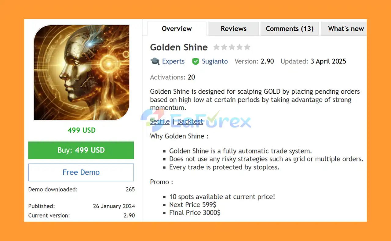 • Flagship Product: Golden Shine EA MT4 is rated as the best performing product of the year.