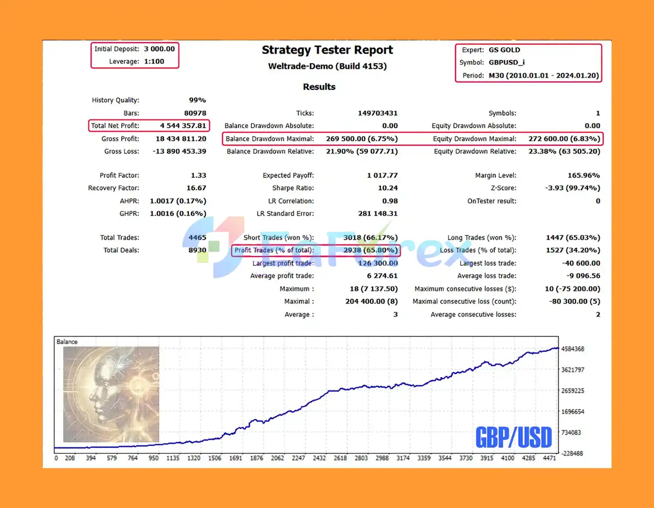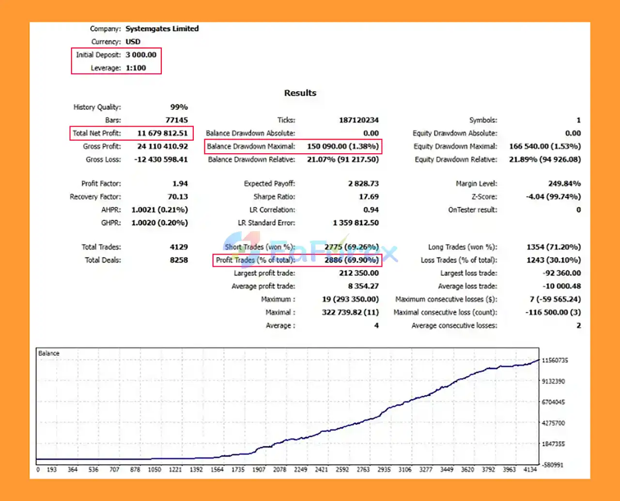Backtest results show strong profitability with low drawdown. Using an initial deposit of $3,000, the EA demonstrated high net profit, a win rate close to 70%, and maximum drawdown of approximately 1.53%, highlighting its efficiency and capital protection focus.