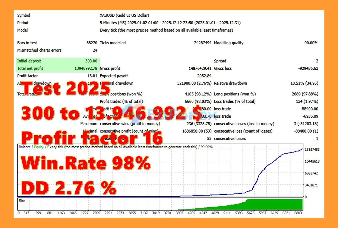 The EA uses a fixed risk percentage per trade, allowing consistent capital management regardless of account size. It also includes maximum drawdown limits and daily loss protection, preventing excessive losses during unfavorable market conditions.