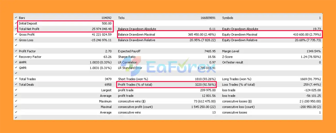 From a $500 deposit → $25.97M profit with a 92.56% win rate and 2.48% max drawdown.