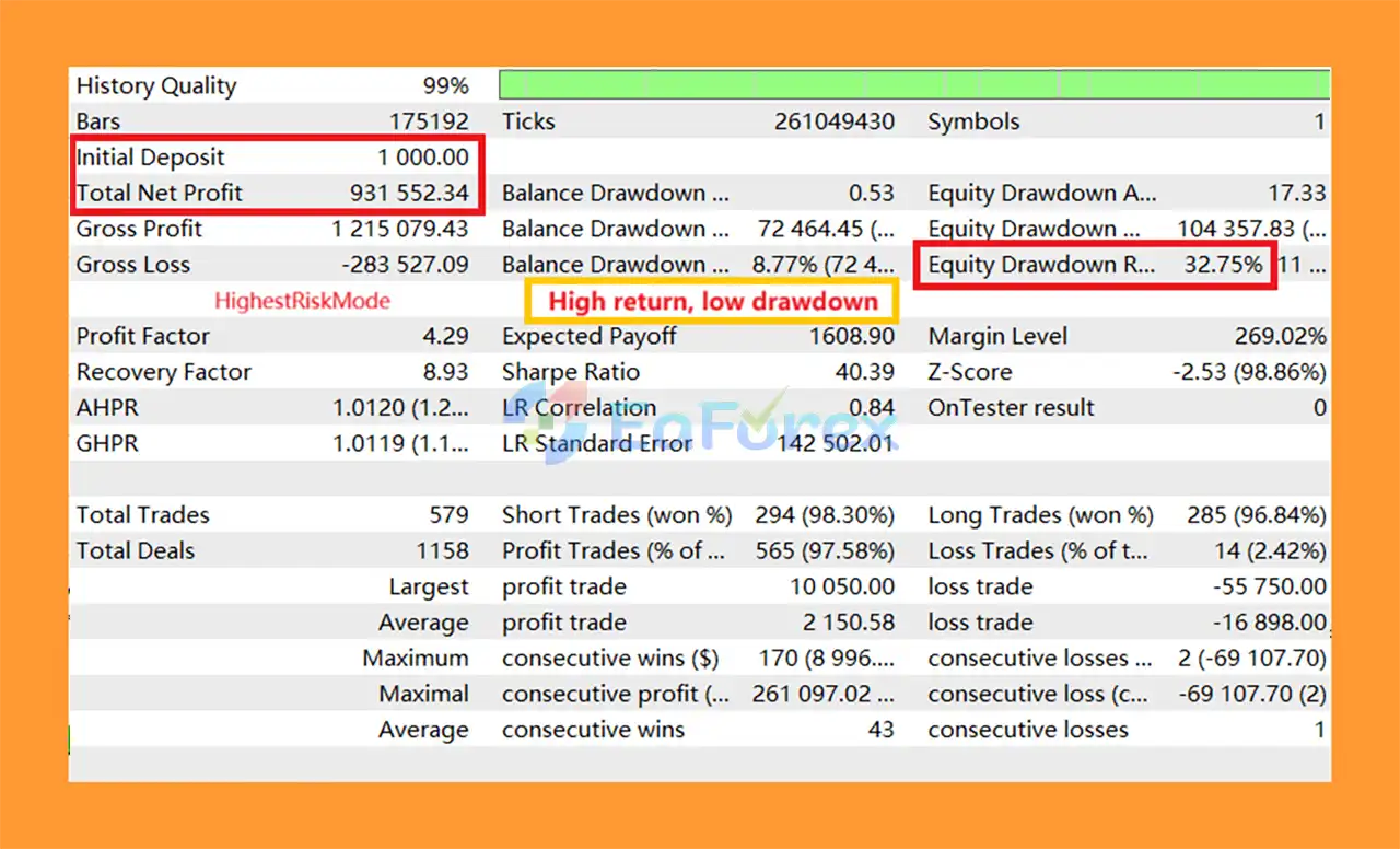 In live results over 5 weeks, GoldMasterFusion MT5 achieved +10% growth, 5.1% drawdown, and an 80% win rate. Backtests in aggressive mode showed a $931,552 net profit from a $1,000 deposit, with 97.58% win rate and 8.77% max drawdown.