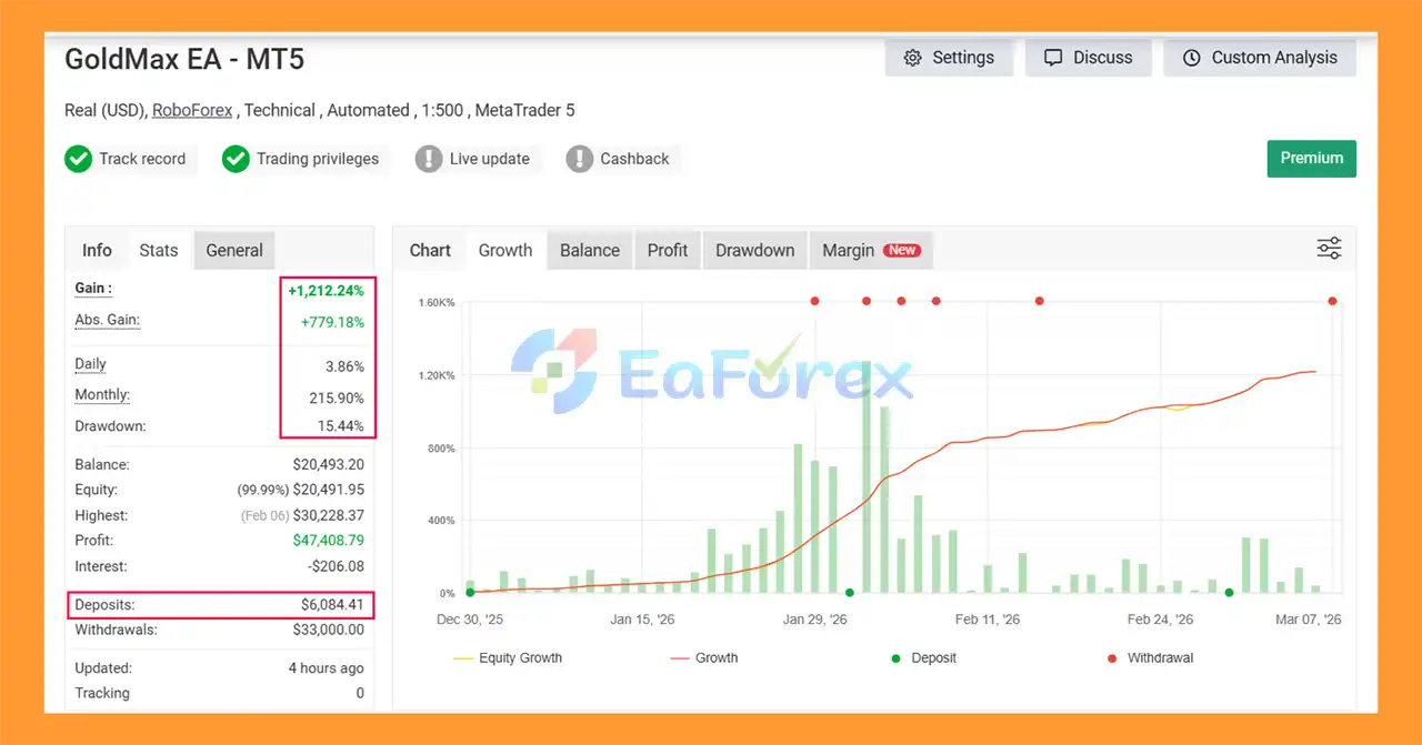 GoldMax EA 5 MT5 is an automated EA for trading XAUUSD, forex, cryptocurrencies, and indices. Its consistent profit performance has been verified by myfxbook.