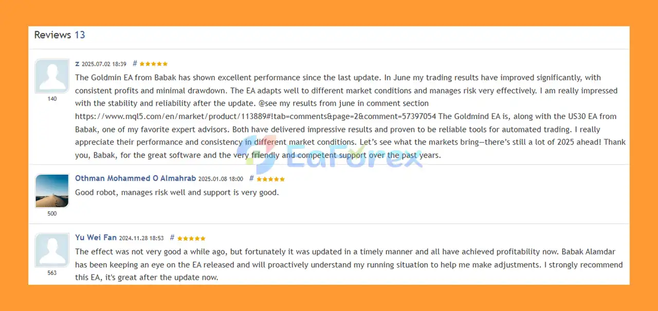 🔺GoldMind AI MT5 is highly appreciated by the MQL5 community for bringing stable and reliable profits. Below are 5 star reviews from users: