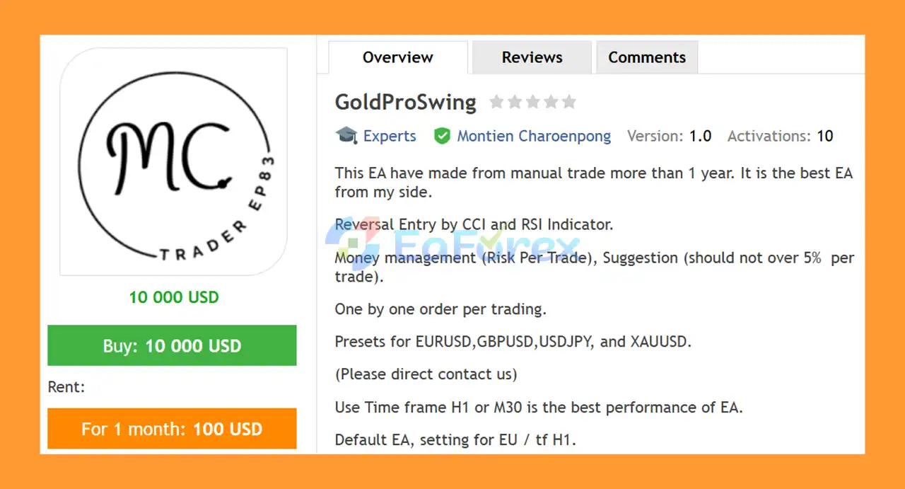 GoldProSwing EA MT4 is an automated trading EA for Forex and gold, using CCI & RSI reversal feature, risk control, stable profit verified by myfxbook.