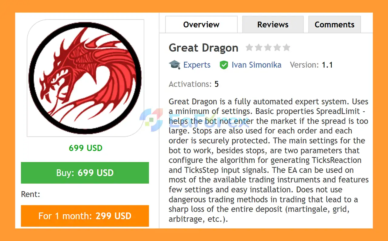 In summary, Great Dragon EA MT4 is a reliable and user-friendly automated trading solution designed for the MetaTrader 4 platform. Powered by a tick-based signal algorithm, the EA focuses on precise market entries while maintaining strong risk management through stop loss protection, spread filtering, and drawdown control. By avoiding high-risk methods such as martingale, grid trading, or arbitrage, Great Dragon EA MT4 prioritizes stable and disciplined trading performance. With simple configuration, automatic money management, and compatibility with multiple forex pairs, it provides a practical Forex Expert Advisor for traders seeking a safe, fully automated, and efficient trading system.