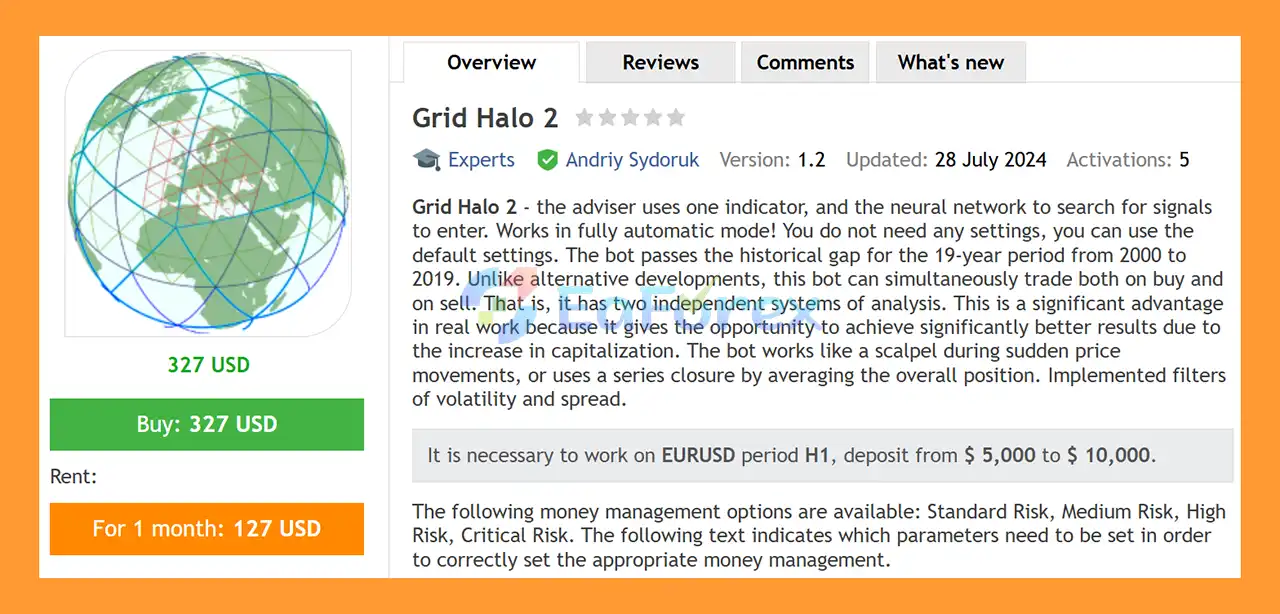 Grid Halo 2 EA MT4 is a fully automated Forex robot that combines neural network AI analysis with a technical indicator to generate precise entry signals. It trades the EUR/USD pair on the H1 timeframe using dual independent systems for buy and sell directions.