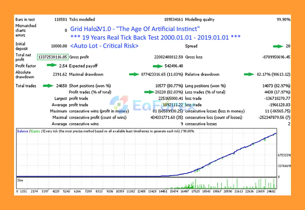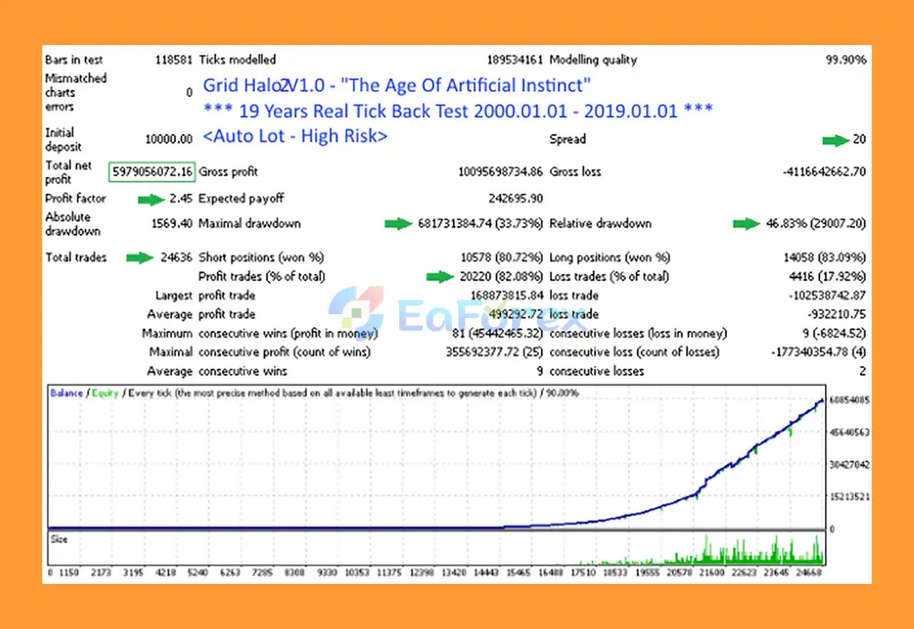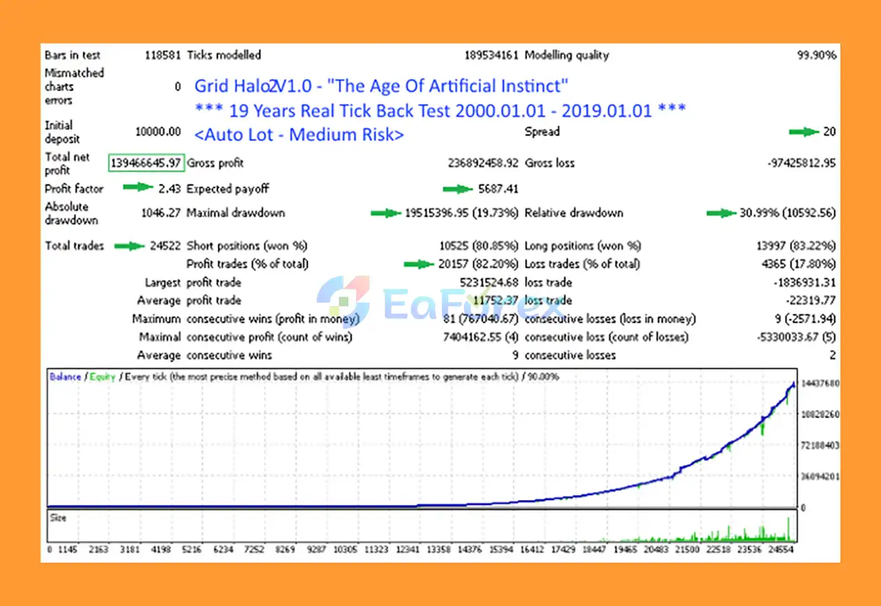 In summary, Grid Halo 2 EA MT4 is a fully automated Forex trading robot that combines neural network analysis with a technical indicator for precise EUR/USD H1 trading. Featuring dual independent systems, it trades both buy and sell directions simultaneously, using series closure and averaging to manage volatility. With advanced risk management, flexible lot sizing, and proven 19-year backtested performance, the EA provides consistent, automated trading with minimal user intervention. Grid Halo 2 EA MT4 is ideal for traders seeking AI-enhanced accuracy, structured grid strategies, and disciplined, long-term capital growth.