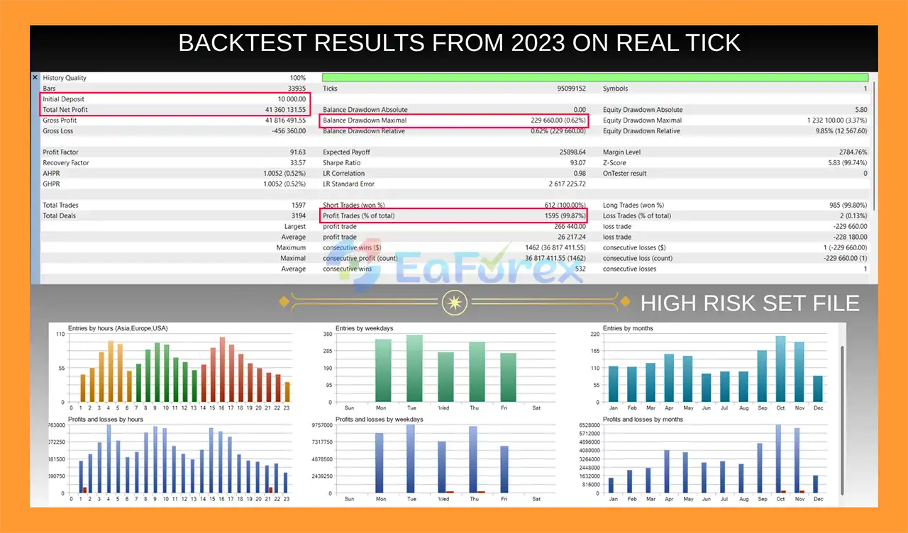 GVolt EA MT5 has demonstrated strong backtest performance over 2 years on XAUUSD, showing extremely high win rates and very low drawdown across different risk settings.