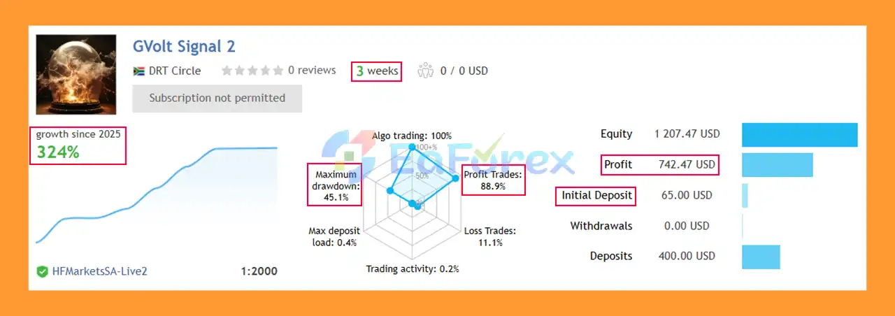 GVolt EA MT5 can operate with a low entry capital, with live signal results showing performance starting from as little as $65, making it accessible to smaller accounts.