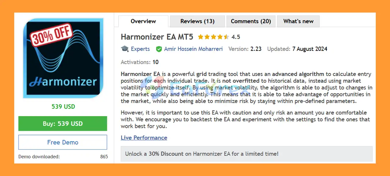 • Notable Products: Harmonizer EA MT5, Harmonizer EA MT4 and other advisors.