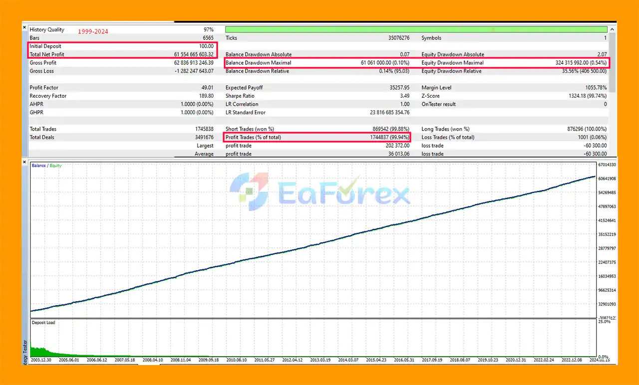 Backtest 2003–2024: $100 deposit grew to $61.55 billion with a 99.94% win rate.
