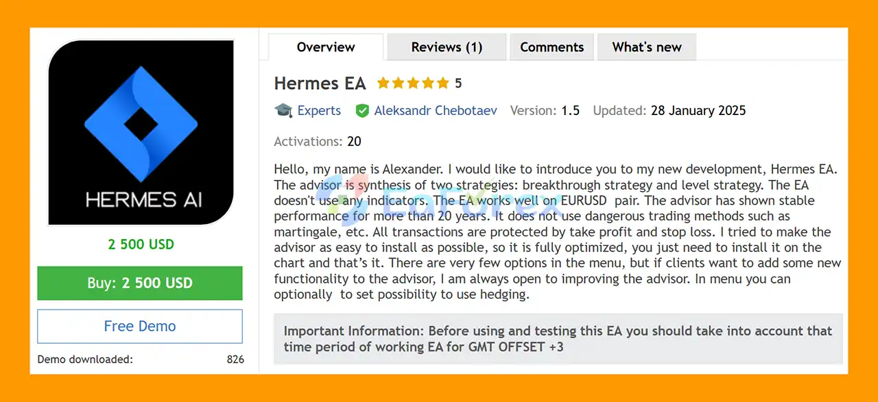 • Notable Products: Hermes EA MT5, Prometheus NG EA MT5 and other advisors.