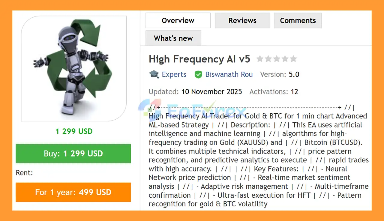 • Notable Products: High Frequency AI MT5, High Frequency AI MT4 and other advisors.
