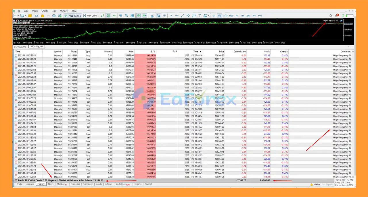 High Frequency AI Trader MT5 is an automated Expert Advisor (EA) designed for the MetaTrader 5. It uses artificial intelligence and machine learning algorithms to analyze market data and execute rapid high-frequency trades, primarily on Gold (XAUUSD) and Bitcoin (BTCUSD).
