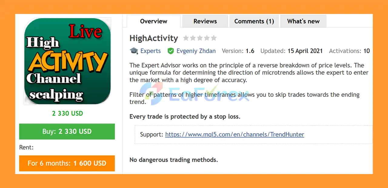 HighActivity EA MT4 is a fully automated Forex EA for EURUSD and GBPUSD, which uses reverse analysis, trend analysis for accurate trading and stable profits.