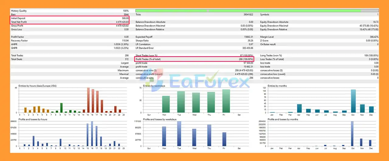 The EA demonstrates precise scalping entries and long-term performance under simulated conditions.
