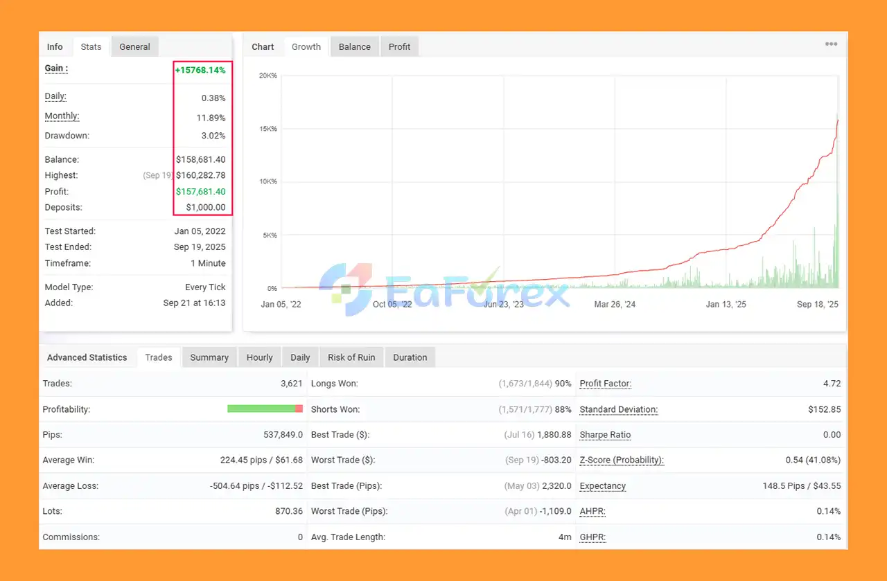 According to Myfxbook verification, the EA shows impressive performance with +15,768.14% total gain, 0.38% daily growth, 11.89% monthly growth, and a very low maximum drawdown of 3.02%, making it a strong performer for Gold trading.