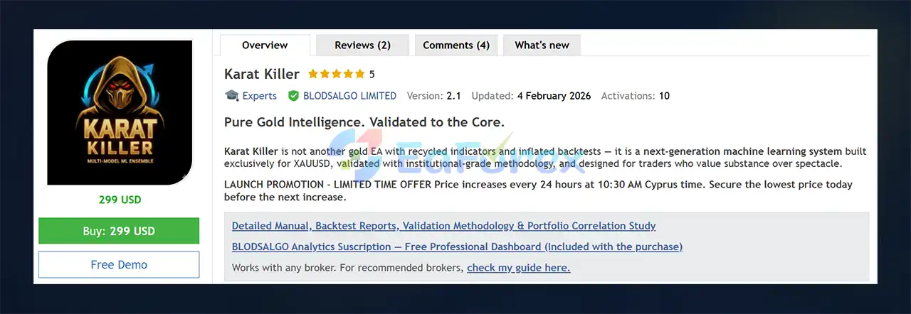 • Notable Products: Karat Killer EA MT5, Stability Killer AI MT5, Pivot Killer EA MT5, Growth Killer MT5 and other advisors.