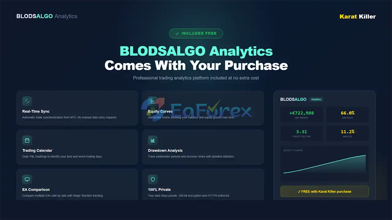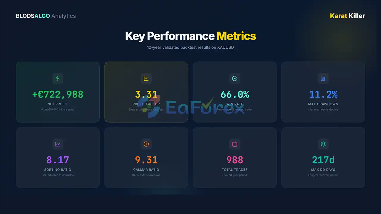 • Karat Killer EA MT5 features walk-forward validation, anti-overfitting safeguards, low historical drawdown, and full performance analytics, making it suitable for serious long-term traders.