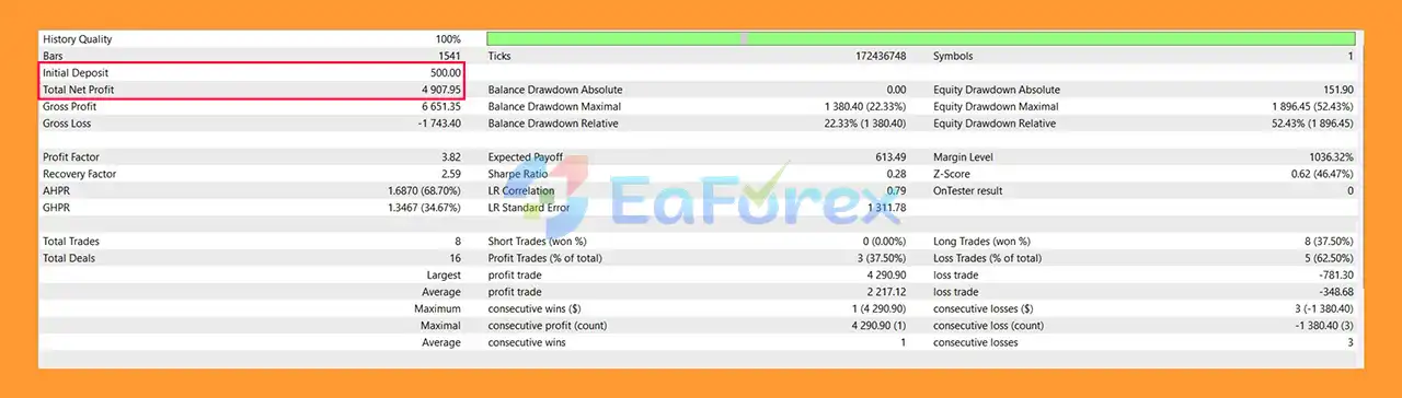 • High Profit Factor Performance: Demonstrates strong efficiency with a profit factor of 3.82 in testing.