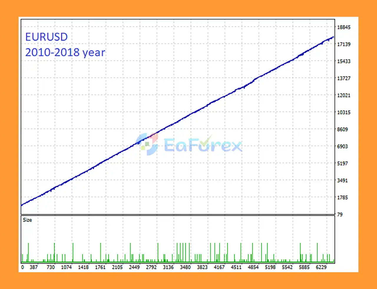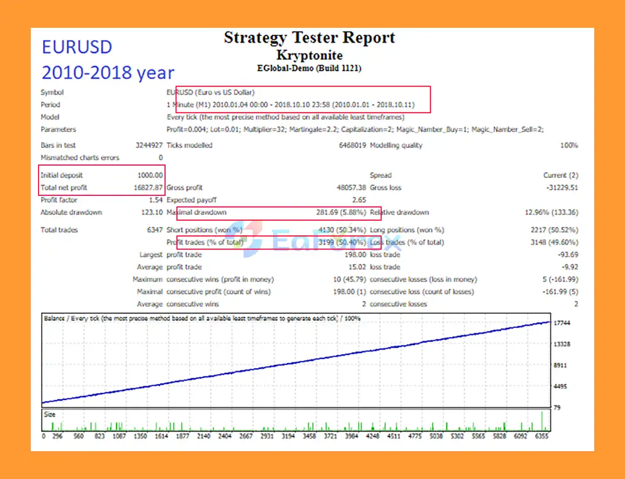 Backtests on EURUSD over 8 years with an initial deposit of $1,000 show a total net profit of $16,827.88 with a maximum drawdown of only 5.88%, demonstrating stable and consistent trading performance.