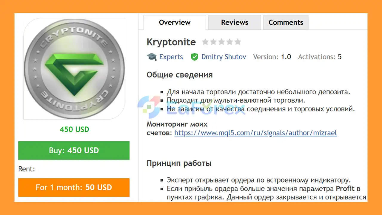 Kryptonite EA MT4 was developed by Dmitry Shutov, a seasoned MQL5 developer with over 10 years of experience. He is also the author of popular EAs like Vulkan MT4, Take Profit MT4, Sur Ron MT4, Minotaur MT4, and Elbrus Way MT4.