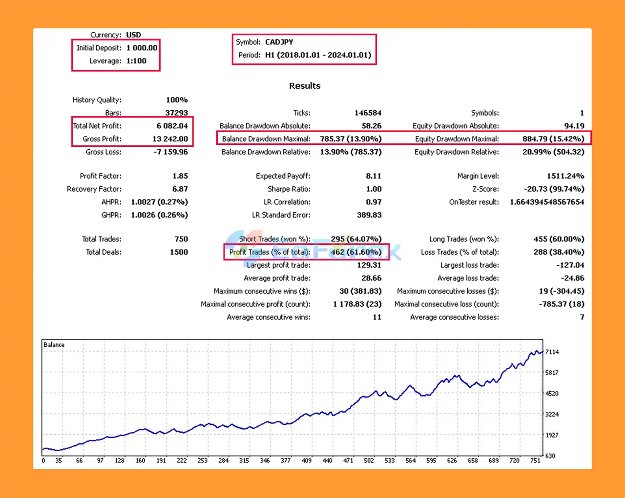 Backtests from 2018–2024 show strong profitability and low drawdown levels across multiple pairs. For example: