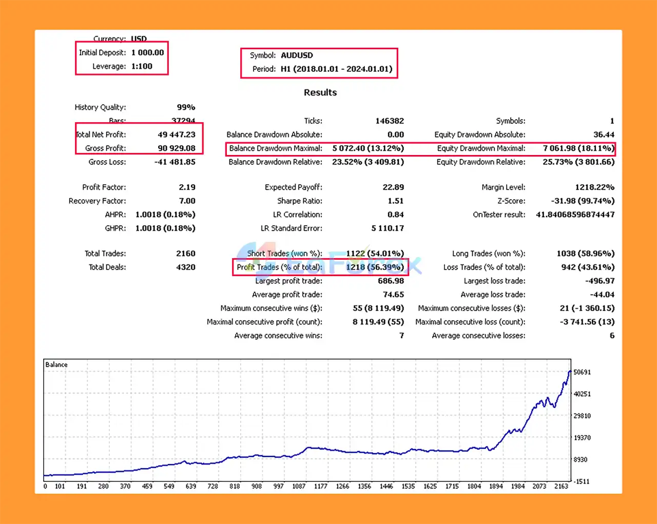 AUDUSD: $49,447 profit with 13.12% drawdown