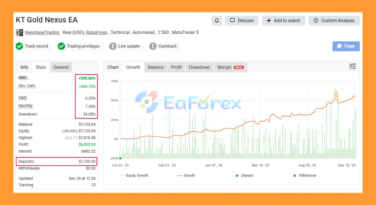 KT Gold Nexus EA MT4 is a professional gold trading expert advisor for XAUUSD on MT4, using multi-indicator analysis and risk control for stable long-term profi