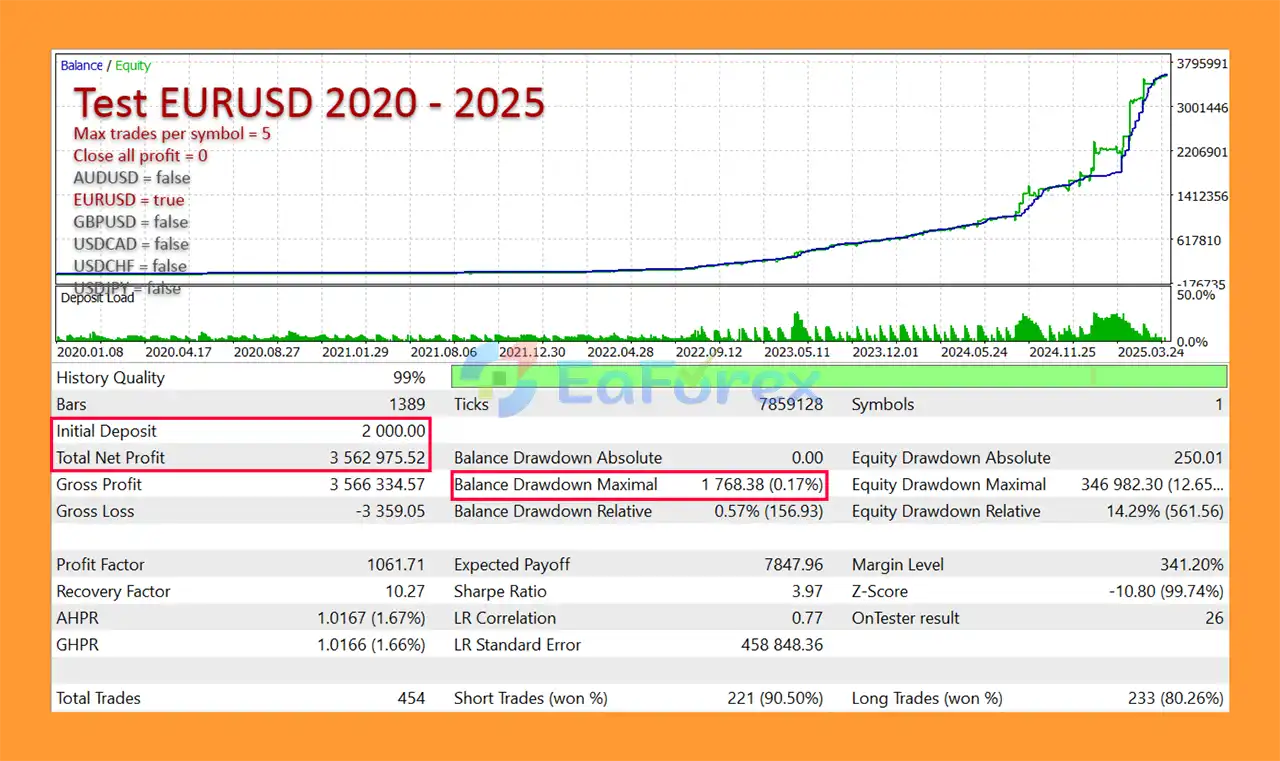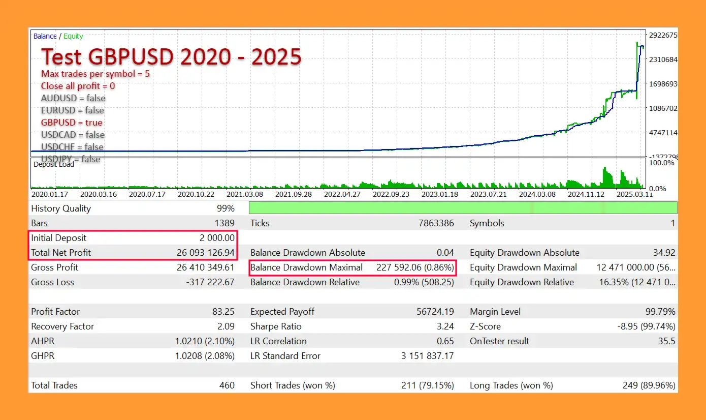 Backtests show impressive results: for example, a $2,000 deposit on EURUSD D1 generated $3.56M profit with 90.5% win rate and 12.65% max drawdown, while GBPUSD D1 returned $26.1M with 0.86% drawdown, demonstrating strong growth potential and controlled risk.