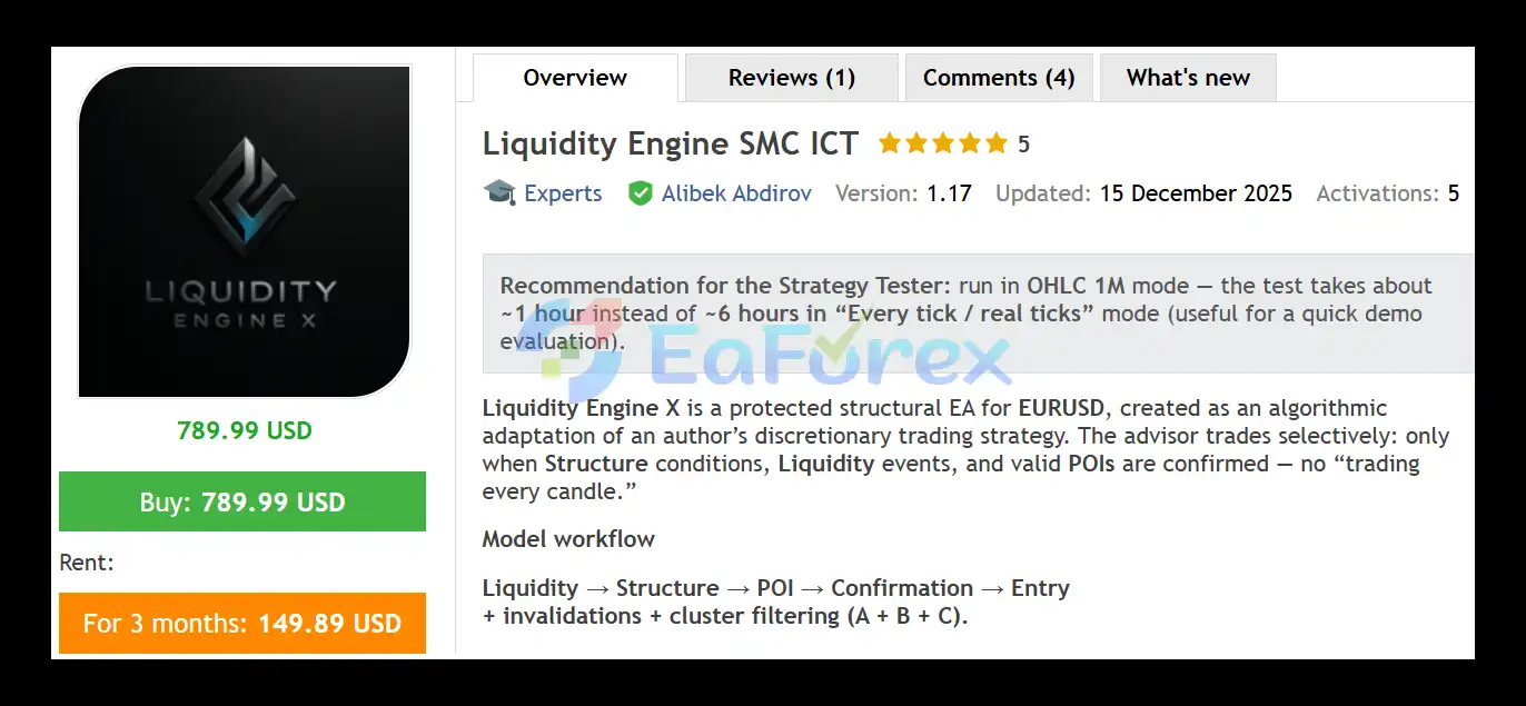 • Notable Products: Liquidity Engine SMC ICT MT5, Liquidity Engine SMC ICT MT4 and other advisors.