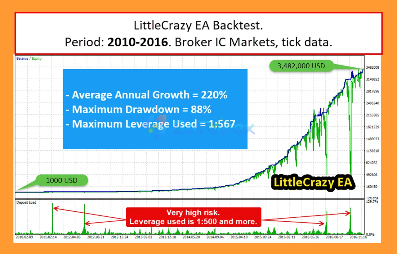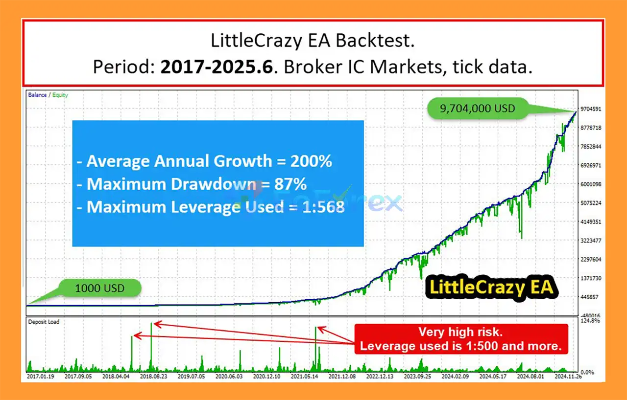 LittleCrazy MT5 is a very high-risk, high-reward EA. While it offers exceptional profit potential, historical backtests show maximum drawdowns of around 87%, meaning significant capital loss is possible.