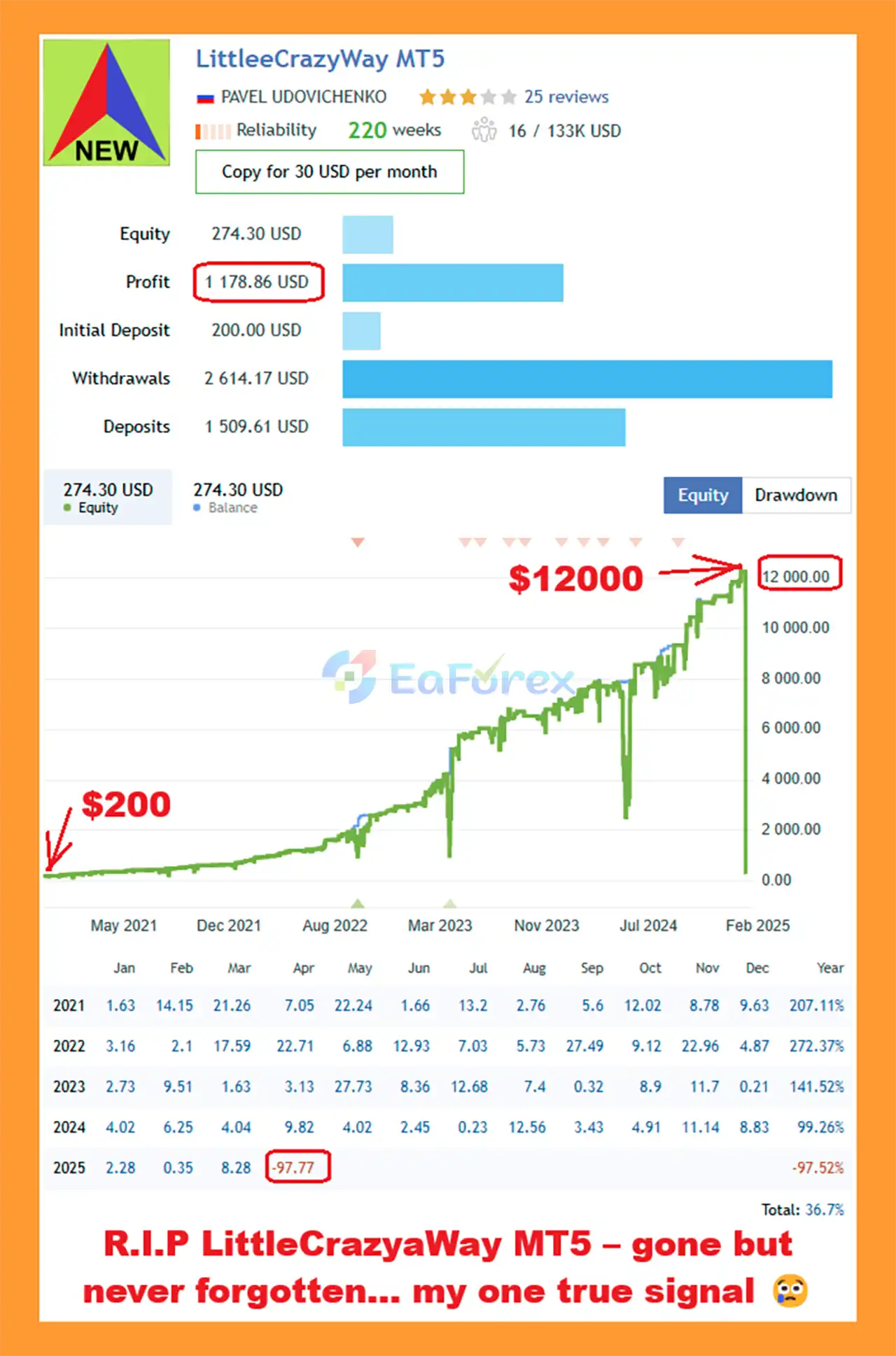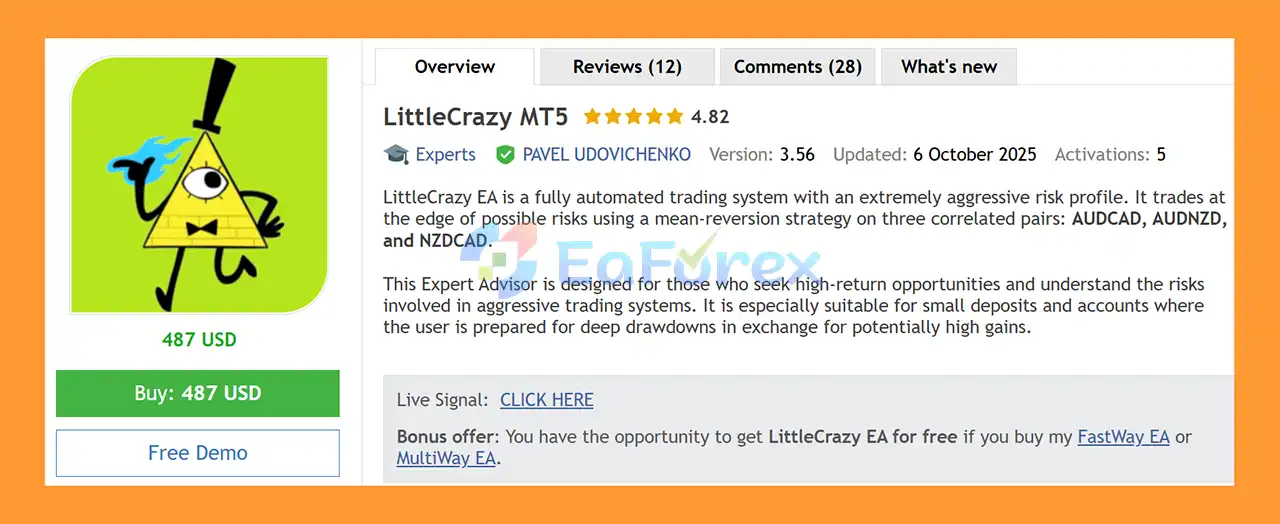 In summary, LittleCrazy MT5 stands out as a powerful high-risk, high-reward automated trading system built for experienced traders who understand correlation, leverage, and drawdown management. With its aggressive mean-reversion strategy across AUDCAD, AUDNZD, and NZDCAD, fully automated plug-and-play setup, and impressive long-term backtest and signal performance, LittleCrazy EA MT5 offers exceptional growth potential for small accounts. However, due to its extreme risk profile and potential drawdowns exceeding 90%, it is best suited for traders seeking maximum returns and who are fully aware of the risks involved in aggressive algorithmic forex trading.