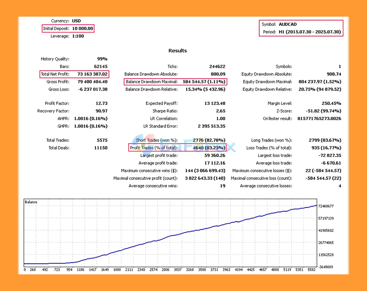 AUD/CAD, 10 years, $10,000 deposit → Total Net Profit: $73.16M, Win Rate: 83.23%, Max Drawdown: 1.11%