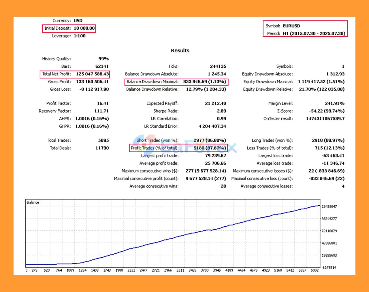 EUR/USD, 10 years, $10,000 deposit → Total Net Profit: $125.05M, Win Rate: 87.87%, Max Drawdown: 1.13%
