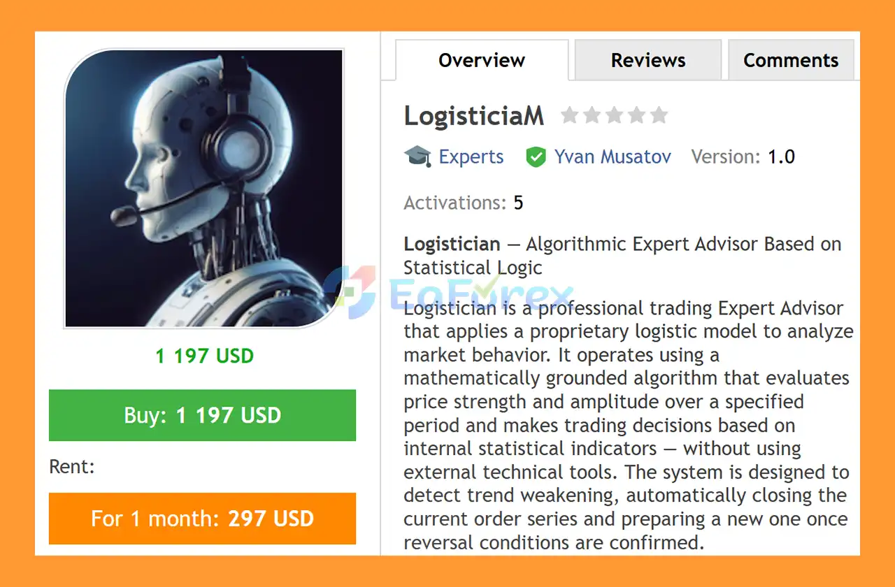 LogisticiaM EA MT4 is a professional, fully automated Forex Expert Advisor that uses a proprietary logistic model to make algorithmic, indicator-free trading decisions across major currency pairs.