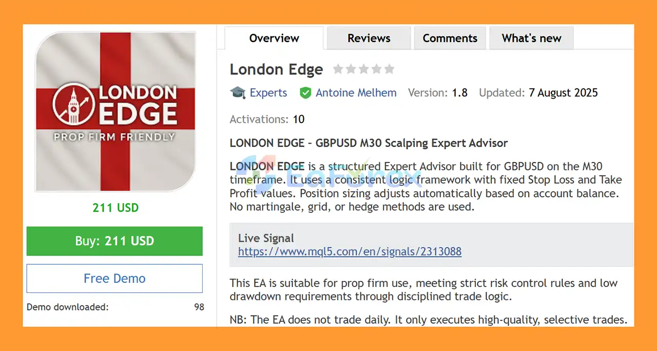 Absolutely. London Edge EA MT5 is prop-firm ready, meaning its disciplined strategy, low drawdown, and structured money management make it suitable for meeting strict funded account rules. Traders looking to scale their capital or pass challenges will find it highly compatible.