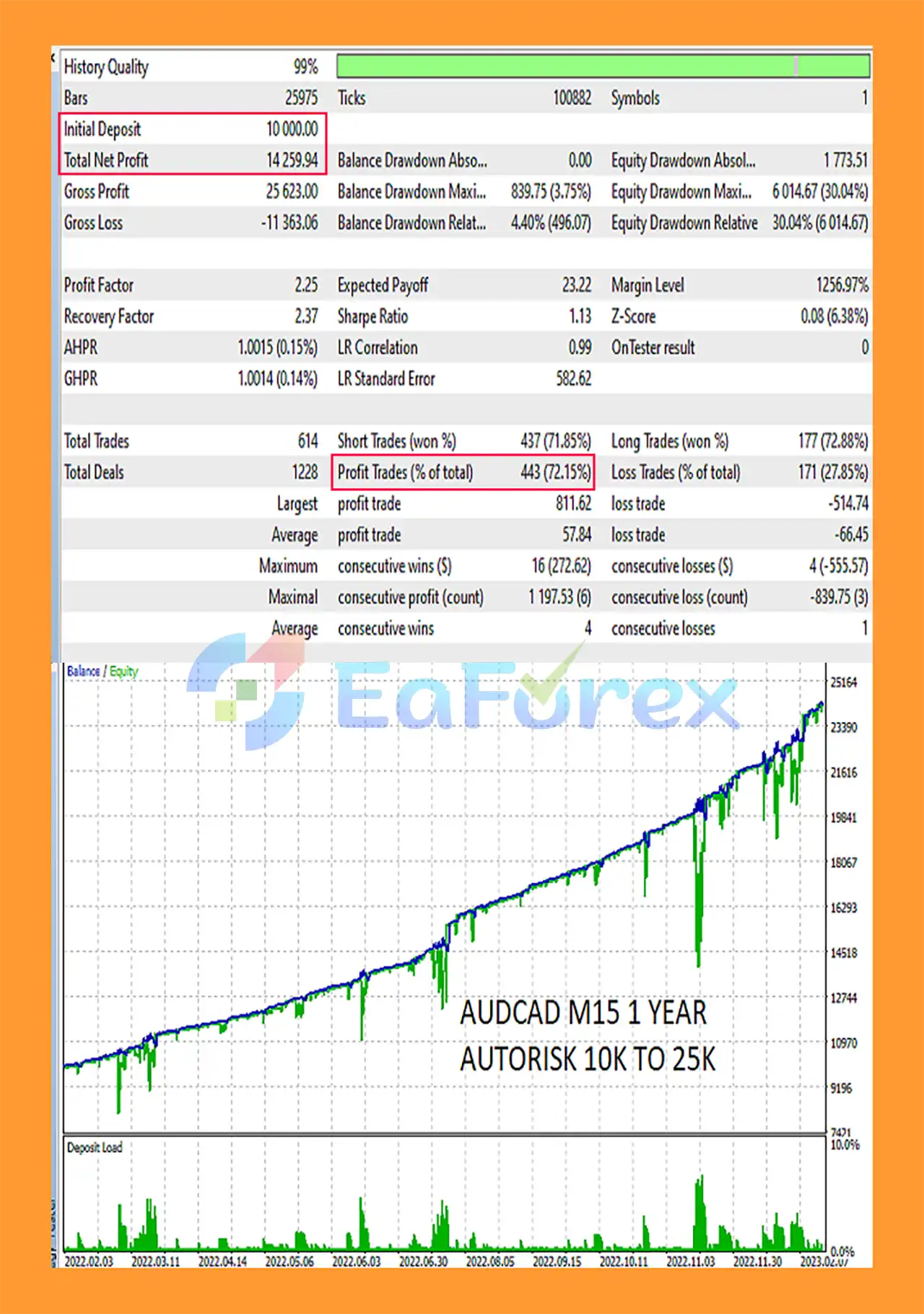 Live results show a 45% net profit with 87.3% win rate and 21.9% drawdown, while backtests on AUDCAD achieved $14,260 profit from a $10,000 deposit with only 3.75% balance drawdown, proving its adaptability and reliability.