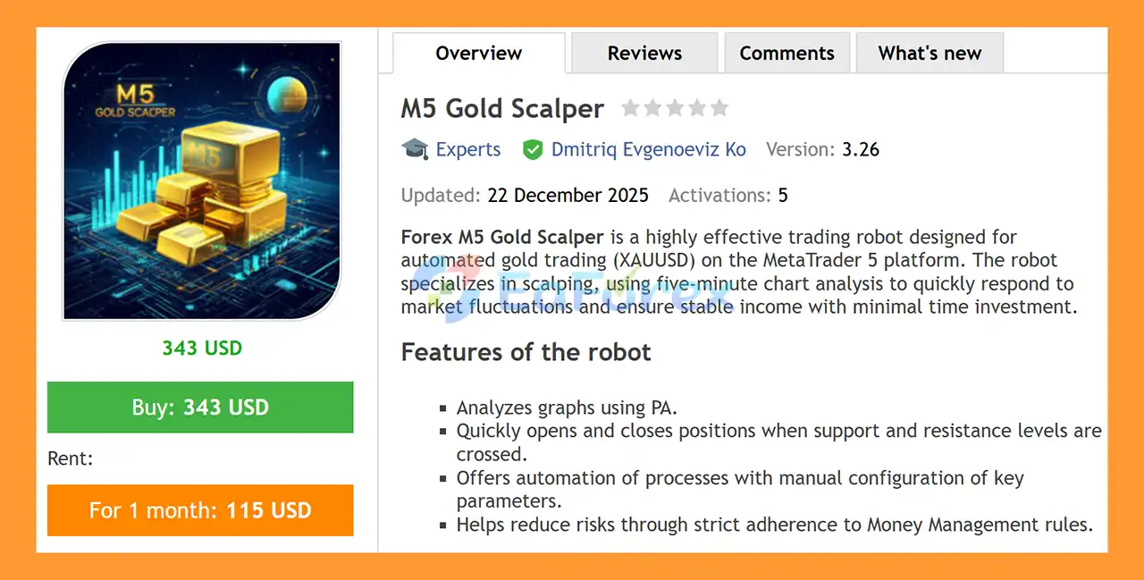 In summary, M5 Gold Scalper EA MT5 is a professional, fully automated trading robot designed for XAUUSD on the M5 timeframe. With advanced price action analysis, support and resistance execution, and high-speed trade automation, it captures short-term gold price movements while maintaining strict risk management. Features like dynamic stop-loss and take-profit, trailing stops, and adaptive money management ensure capital protection and consistent profits. Beginner-friendly yet powerful for experienced traders, M5 Gold Scalper EA MT5 is optimized for stable, efficient, and low-drawdown trading in volatile gold markets, making it a top-performing MT5 scalping solution in 2025.