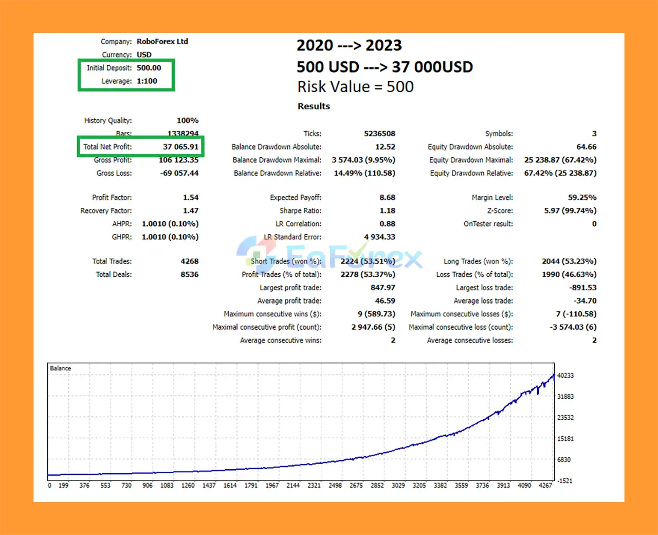 Backtests from 2020–2023 with a $500 initial deposit showed $37,065.91 net profit and a maximum drawdown of only 9.95%, demonstrating its potential for consistent and low-risk growth.