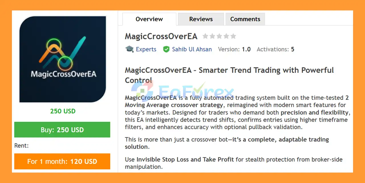 • Notable Products: MagicCrossOverEA, Dream Trend EA, Smart Combine EA, SuperTrend EA Pro MT5, Gold Scalper Ultimate EA, Gold Beast EA, QuantBot Studio EA, MagicCrossOverEA, Smart Combine EA, Gold Trend EA Pro other advisors.