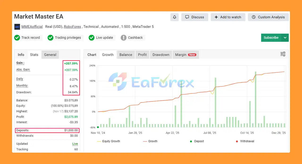Yes. Market Master EA MT5 has Myfxbook-verified trading results, including a +207.59% total gain on EURUSD over 14 months with an average monthly profit of 8.47%, confirming its real-world performance.
