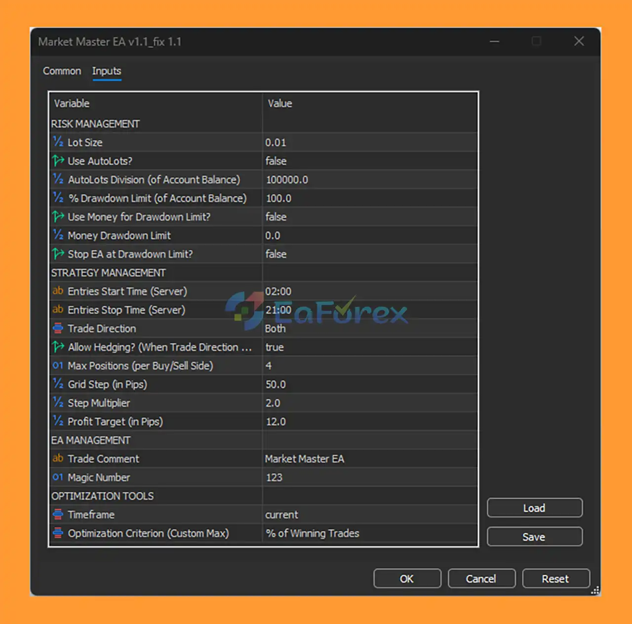 Drag Market Master EA onto the desired currency pair.