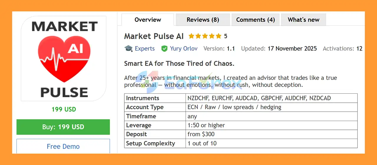 • Ravil (2025.11.21): “OMG guys this Market Pulse AI is fire!!! Yury is the best developer ever, replies super fast even on weekend, gives pro advice like a friend. No fake promises, honest trading. Running smooth on my favorite crosses. If you hesitate – just buy it already!”