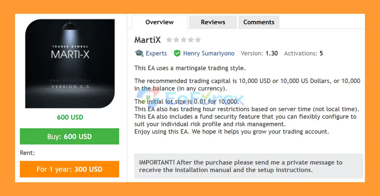 In summary, MartiX EA MT4 is an automated Forex trading system built around a structured martingale strategy for traders who understand and accept this trading approach. It features predefined capital requirements, controlled lot progression, and configurable fund security settings to help manage risk and protect trading capital. With automated execution, fixed trading hours, and customizable risk parameters, MartiX EA MT4 is best suited for experienced traders seeking a systematic, hands-free martingale EA with clear rules and disciplined money management.