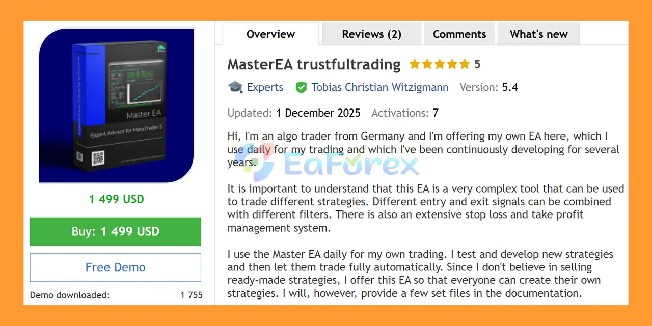 The EA was developed by Tobias Christian Witzigmann, a German MQL5 developer with over 2 years of experience, also known for MasterEA Trustfultrading MT4 and other automated trading tools.