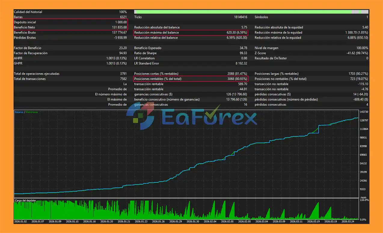 Backtests show strong performance with an initial deposit of $21,000 generating approximately $131,835 in net profit, an 80.93% win rate, and a maximum drawdown of 10.39%.